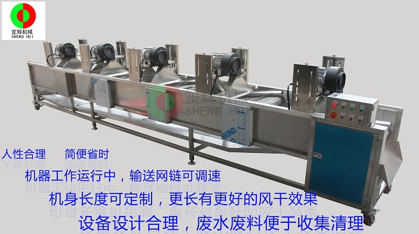 3、清洗完畢后通過傳動鏈網(wǎng)將蔬菜自動輸送至網(wǎng)帶式翻轉(zhuǎn)蔬菜風(fēng)干線  對蔬菜進行翻動風(fēng)干(吹風(fēng)為常溫,較好的保護蔬菜保持物料本身的色澤和品質(zhì))。